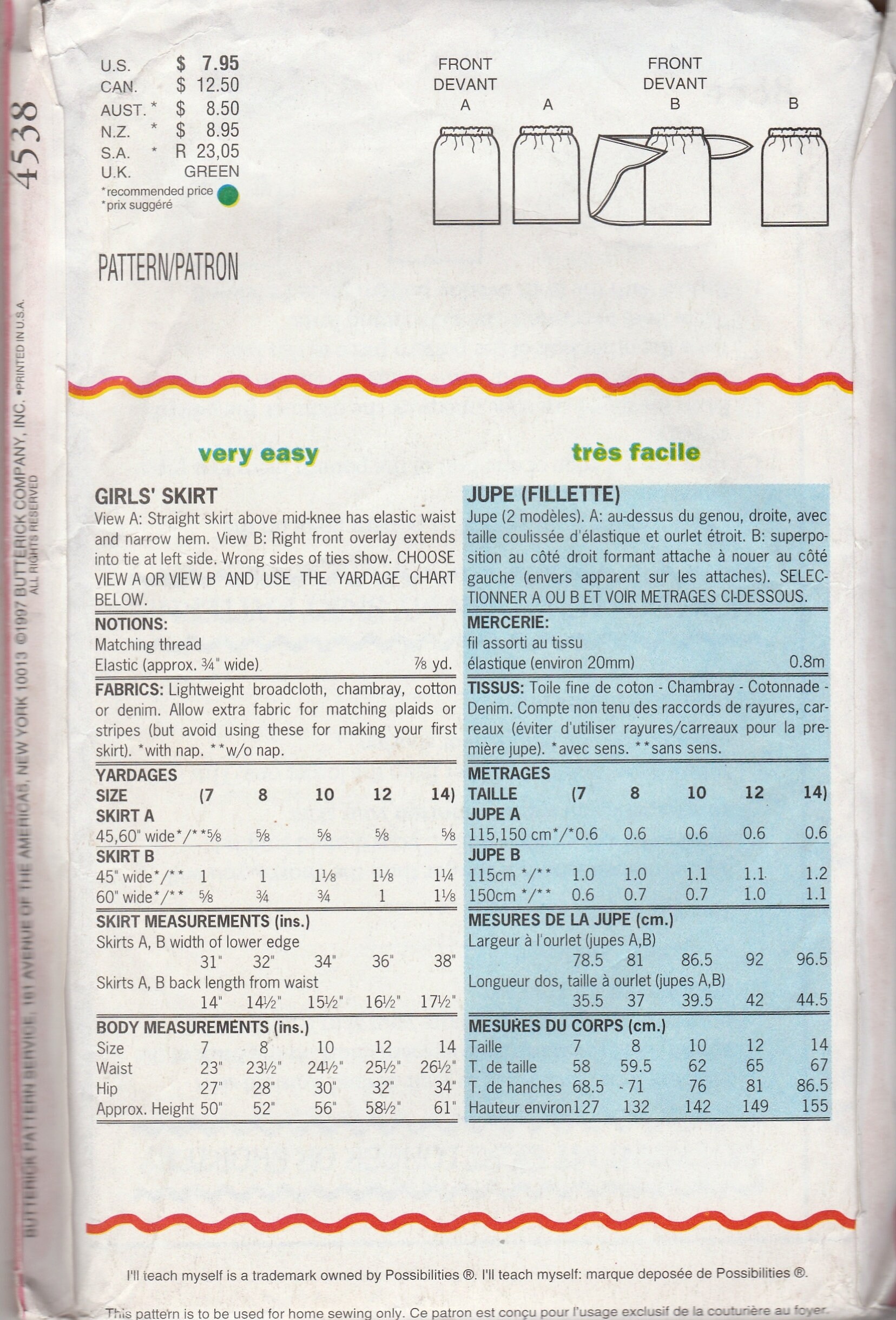 Sewing Pattern Butterick 4538 Girls Skirt All Sizes Etsy